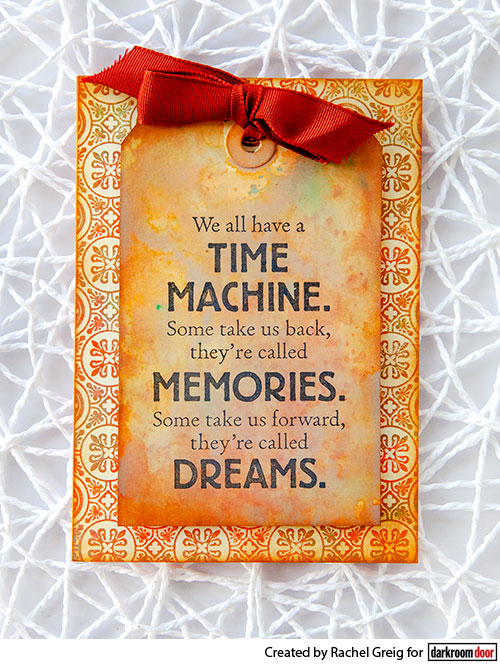 3. Stamp the Time Machine Quote Stamp onto the tag using Archival Jet Black ink. Tie some ribbon through the top of the tag and adhere to the card with foam adhesive.