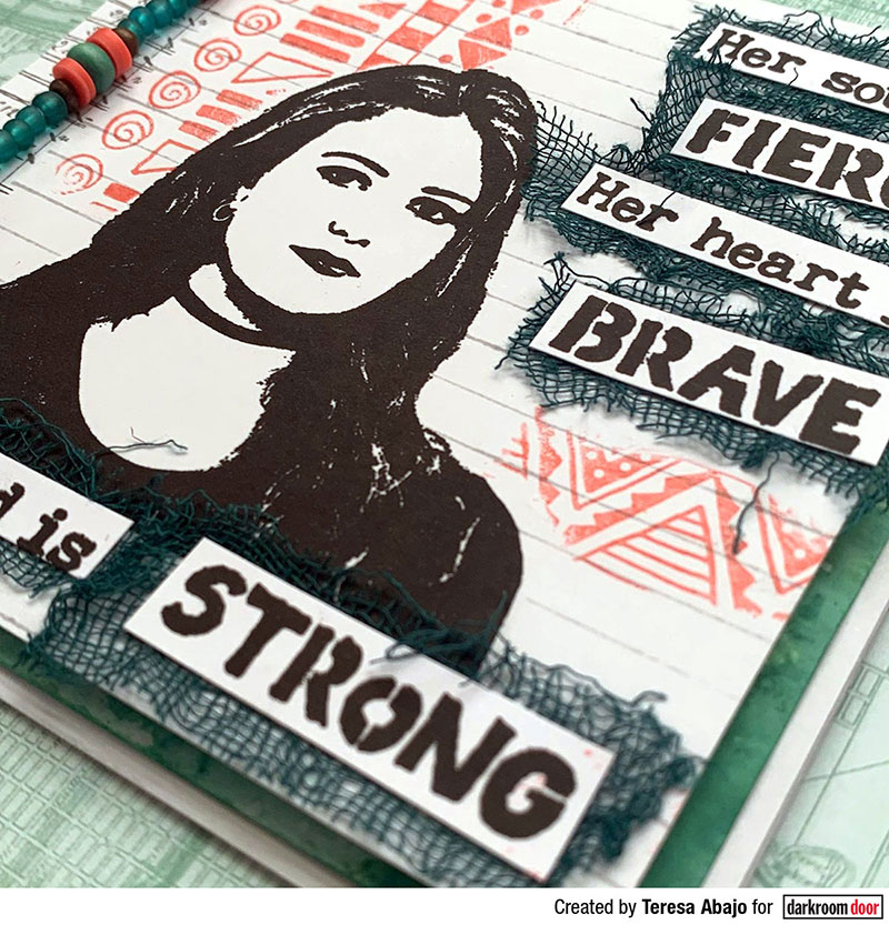 Suzz Czosek created a text style background by stamping all the Be Bold senitments and quotes over the kraft card base. Added one of the images on top, along with some strips from the Tribal Texture Stamp.
