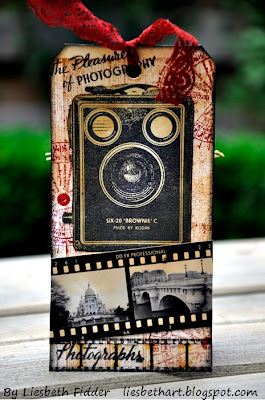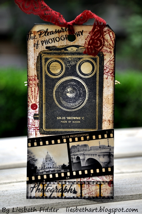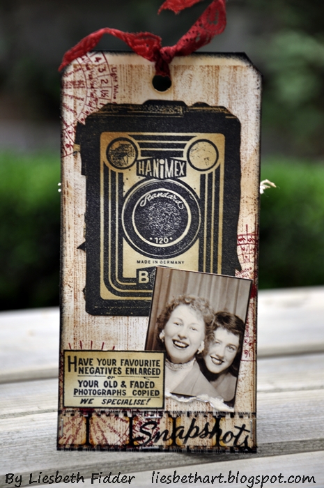 Hi, it's Liesbeth here! Love to play with the new Darkroom Door Box Brownies stamp set! The very vintage old look of the stamps is wonderful and I also love the texts on it!I made a chunky ATC and two tags: