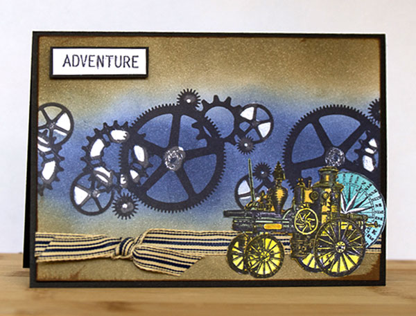 Stamp Darkroom Door Cog Collection Eclectic stamp three times across a panel of white cardstock cut to suit a black card front. Highlight some areas of the stamp using a white crayon and sponge across the centre with Chipped Sapphire Distress ink. Sponge either side of the purple with Frayed Burlap ink and then sponge the top and bottom with Vintage Photo ink. Sponge each side with Vintage Photo ink to give the edges some depth. Tie panel with ribbon and affix to card front. Stamp the word ‘Adventure’, the engine and compass from the Darkroom Door Steampunk set onto white cardstock using black Archival ink. Trim the word, layer with black cardstock and mount onto card front with foam tape. Colour the other pieces with Distress Markers, trim closely and add to card.