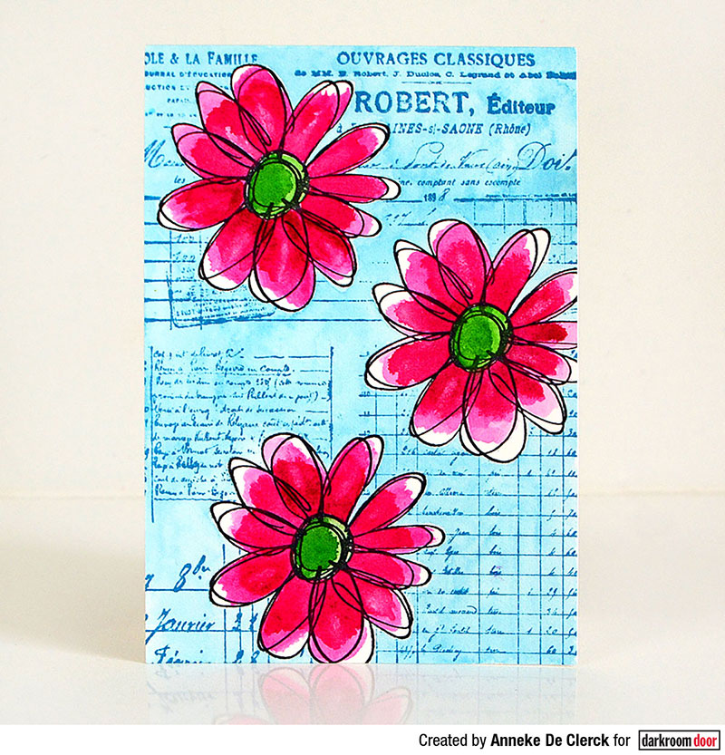 Anneke De Clerck created this one layer card by stamping the Scribble Daisy Eclectic Stamp on the card and masked over the flowers before stamping the Handwritten Ledgers over the top! It's a great way to add a "background" easily after stamping the focal images!