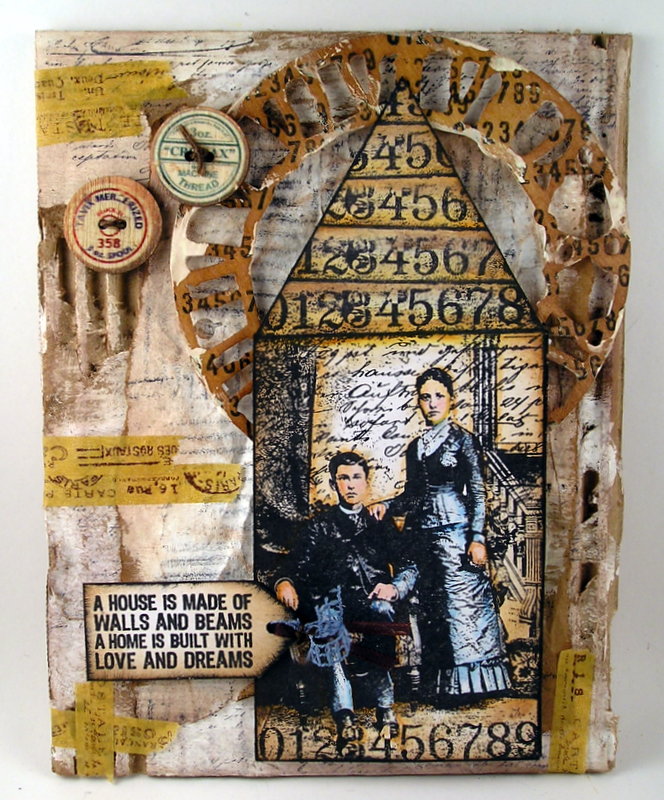Stamp the Home Sweet Home sentiment using black ink on white cardstock. Distress with brown dye ink and ink up the edges with black ink. Cut into tag shape. Punch hole and add ribbon. Assemble the collage and add button accents to the side.