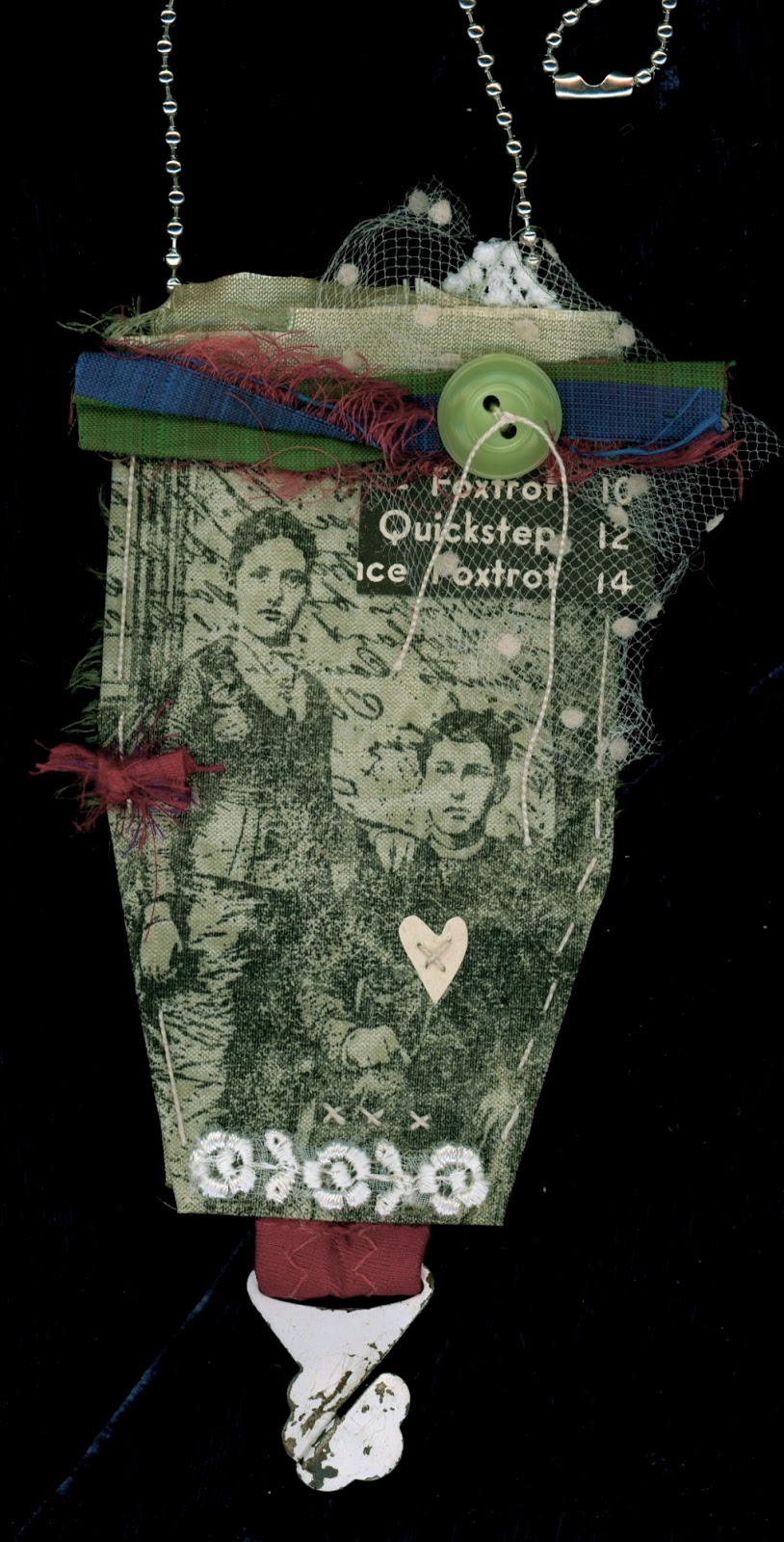 Details from Susie: I've been having a great time with Henry & Harriet at my house this week! I've had some TAP (transfer artist paper) by Lesley Riley tucked away for quite sometime and thought it was time to have a play with it. I stamped Henry and Harriet onto a piece of TAP and then ironed it onto some sage green raw silk. I was really impressed with how much detail was transferred. The piece then evolved into a necklace as I stitched and added layers of fabric, lace, paper and found objects.