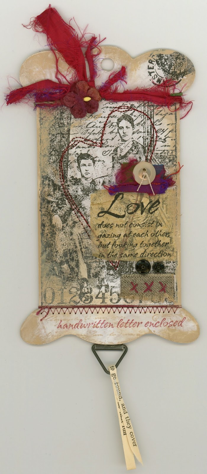 Supplies for the card and tag:Darkroom Door products:Stamps: Henry & Harriet Collage Stamp, French Script Background, Love Letters Vol. 2Other products:Dies: Sizzix: Fancy Oval Frame, Tattered Banners, Flower & Heart, Hearts & More set, Mini Labels, 3-D & Vine FlowerInk: Ranger Archival Ink Jet Black; Distress Ink: Gathered Twigs, Barn Door, Black Soot, Scattered Straw; Tsukineko Walnut Ink CrystalsPencils: Derwent Artist PencilsPaint: Distress Paint: Brushed PewterSurfaces: Core'dinations Tim Holtz kraft-core cardstock; manila tag; old dictionary paperEmbellishments: Tim Holtz Idea-ology Chit Chat stickers; Studio Calico wood veneer Hearts, Butterflies and Cameras; cheese cloth; ribbons and lace trim; pearlsAdhesive: Ranger Glossy Accents, Crackle Accents
