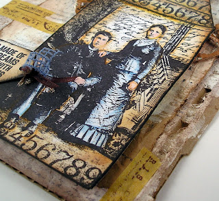 I stamped the collage stamp onto a tag, colored it with Distress ink and a water brush and added some tissue tape.