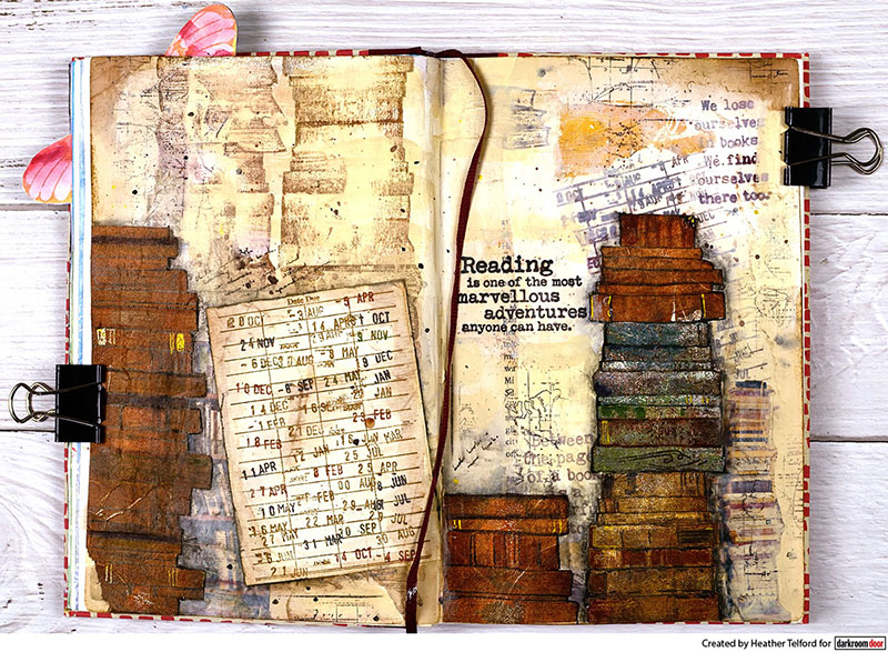 Heather Telford created a stunning art journal page using the Library Books and Bookworm Stamp Sets together: