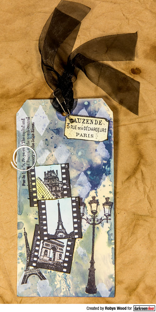 3. Stamp the tag with the Paris definition and lights from the Tour Eiffel stamp set using black Archival ink.