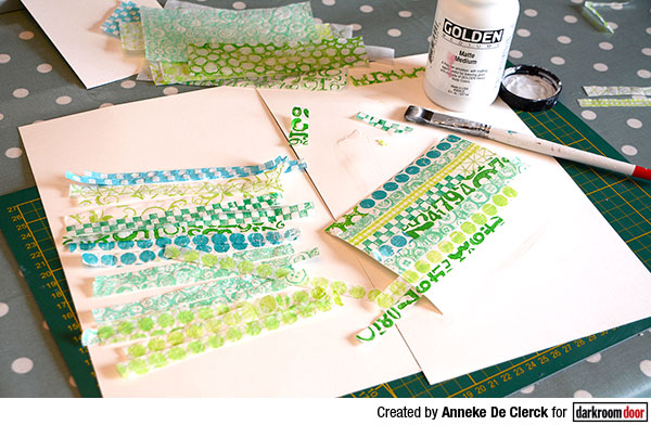 1. Stamp on white tissue paper with various Darkroom Door Background Stamps using green, blue and turquoise paint.