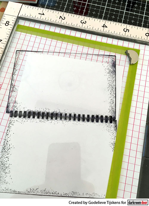 1. Stamp the Spiral Notebook stamp at an angle on the bottom of a white folded card, using black Archival ink. Cover the stamped image with a post-it note to stamp the second above the first one. Cover this print too with a mask to stamp the notebook a third time.