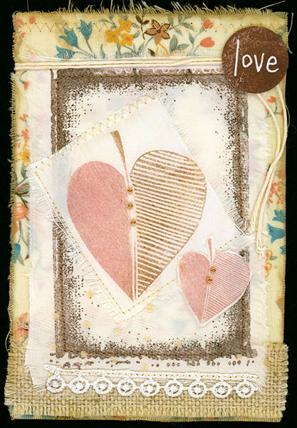 I began each of the postcards by stamping the Emulsion Frame onto silk. I suggest experimenting with different ink on a small sample of silk to see how it reacts to the fabric. I used Distress Ink on the 'Create' postcard and found it left a very blurry image (which I like) and VersaMagic for the other frame. I used VersaMagic for all of the 'Carved Leaves' images. I also stamped words from 'Simply Circles' onto card. Then it was a matter of layering fabrics, lace, tulle and stitching them into place. I embellished the leaves with beading, twine and the words to complete each postcard.