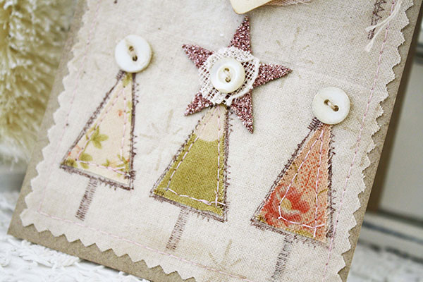 Instead of using paper for my background, I stitched a scrap of muslin to my card base and then added stamped stars using Kraft ink. I topped each tree with a vintage button, and the center tree with a glass glitter star, and a bit of vintage trim.