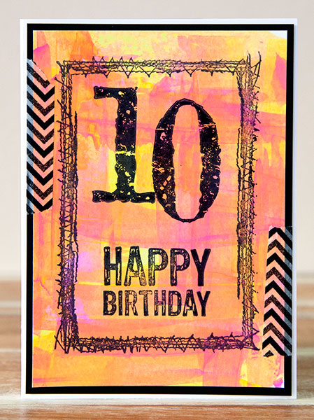 Create a background by scraping Dina Wakley Acrylic Paints over a scrap of cardstock. Using black ink, stamp the Stitched Threads Frame Stamp, then the number '10' using numbers from the Big Numbers set. Stamp the sentiment using a stamp from the Happy Birthday Stamp Set.