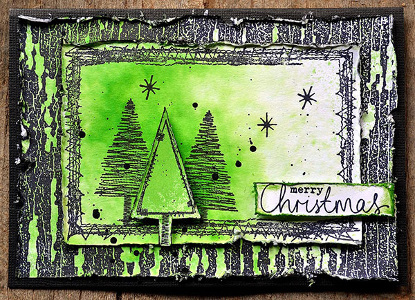 3. Stamp another Christmas tree onto a scrap of white cardstock. Spray with water and a little of the Cut Grass Ink Spray. Dry with a heat gun, cut out and add to the frame with 3D foam. Flick a little black paint over the top of the card.