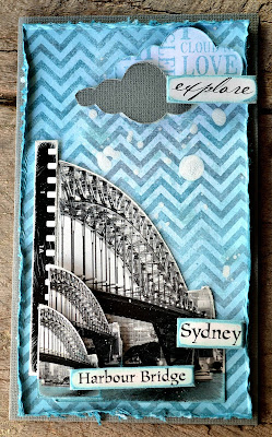 My last card was created in a similar fashion to my second card with a blue background. I have cut the sky away from three images of the Sydney Harbour Bridge, sanded the edges and layered one on top of the other. I have also added a strip from the edge of the Filmstrip.