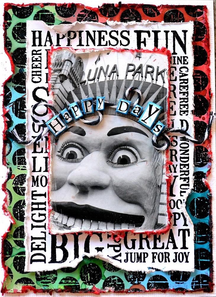The Luna Park image from the Sydney Photochips was the first image that caught my eye. It is such a fun and vibrant photo and brings back memories of visiting there as a very small child. I knew that I would need some gorgeous bright colours to match the photo. I started by stamping the Polka Dots Background Stamp onto white cardstock with Versamark Watermark and heat setting some black embossing powder. I applied various Distress Inks and splattered with Dylusions Ink Sprays. I also applied the Smile Word Block Stamp to white cardstock and heat embossed black embossing powder again before layering onto the polka dot background. For the image itself I simply sanded the edges, distressed and added red ink to the edges. I cut individual letters from the Sydney Wordstrip and adhered to scrap chipboard before gluing onto the twine.