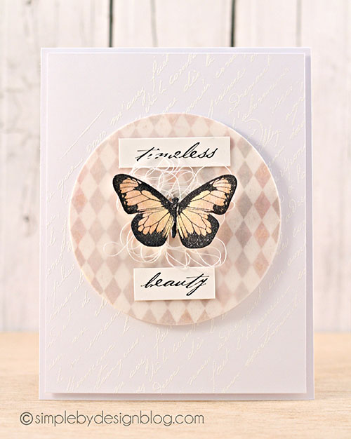 • Adhere this circle to a piece of white card stock that was stamped and embossed with the French Script Background Stamp and adhere the whole panel to a trimmed white card.