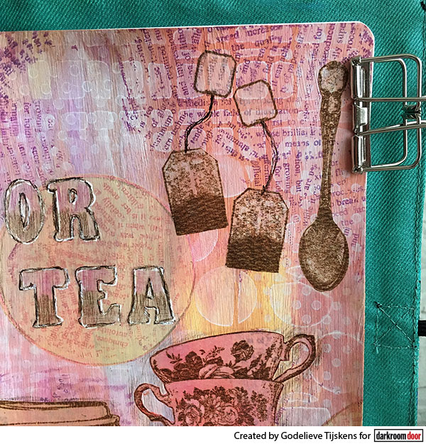 This next project is an art journal page where Godelieve has used the Torn Text Texture Stamp to add little text details to her page. Godelieve has also used the Coffee Time & Cup Of Tea Stamp Sets and the Teacups Photo Stamp.